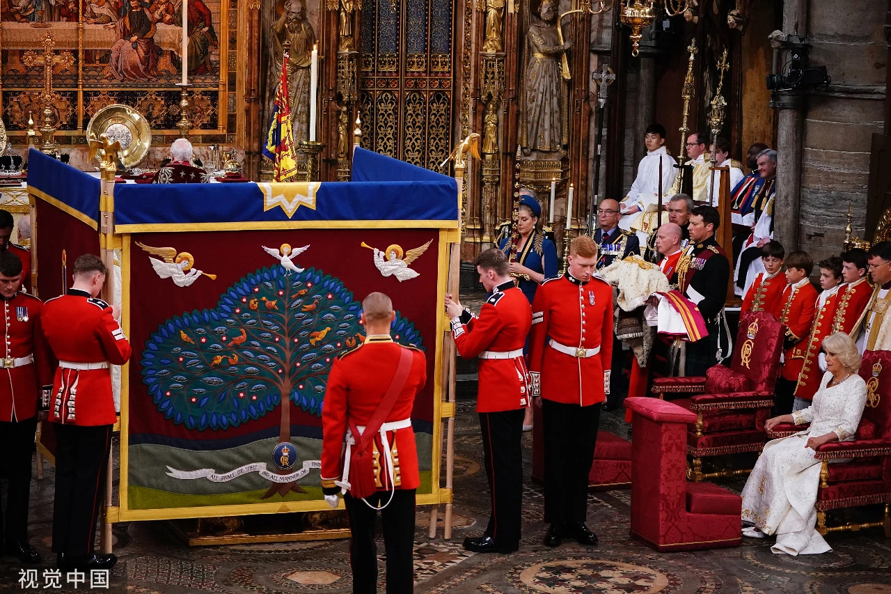 一向讲究、仪式感颇多的英国王室,还在王座底下放置了一块来自苏格兰的斯康石,又称命运之石,已经拥有超1000年历史,象征着苏格兰君主制,也寓意赋予君主神圣力量。其实上面那把椅子,当初就是专为容纳斯康石而建造。