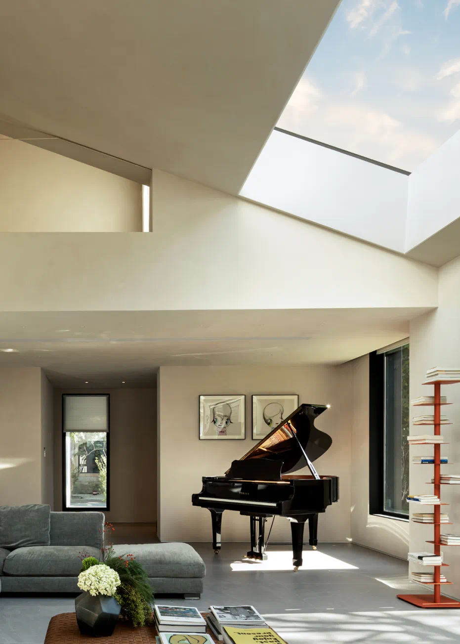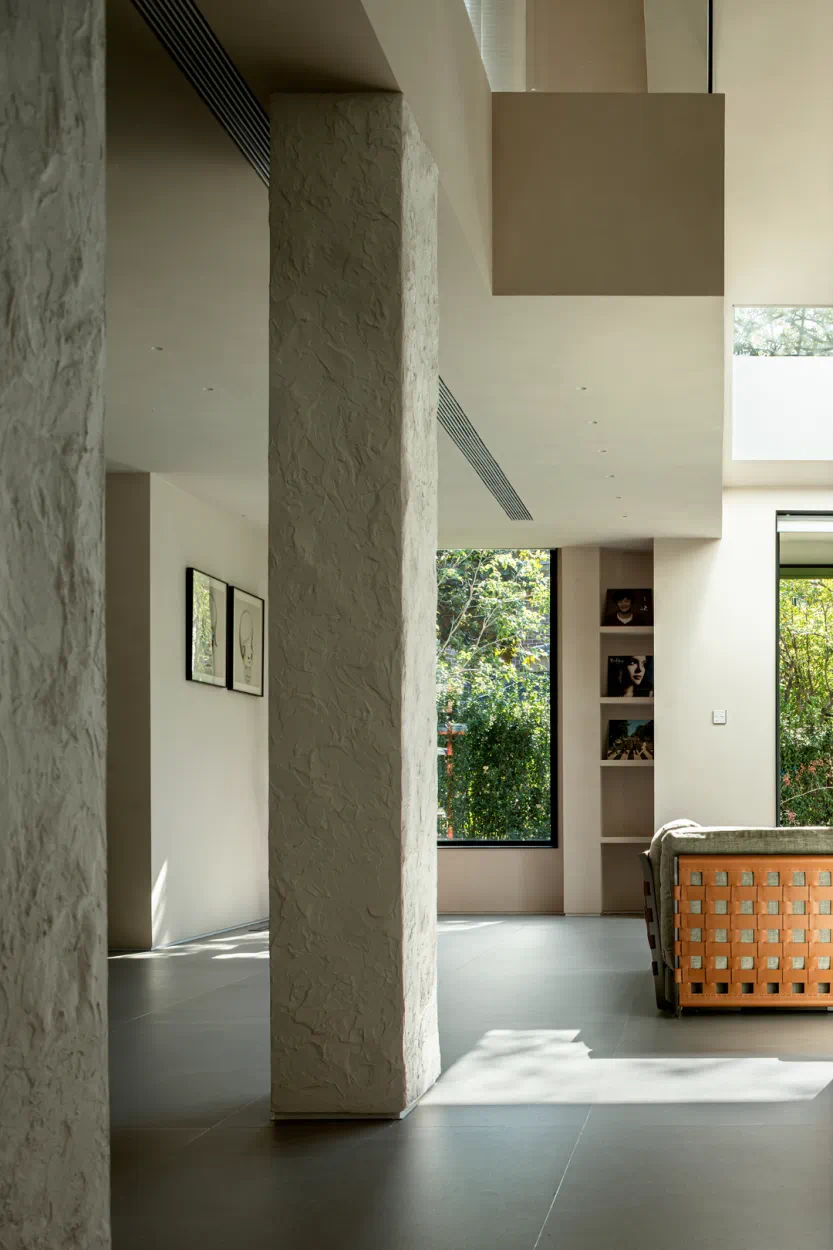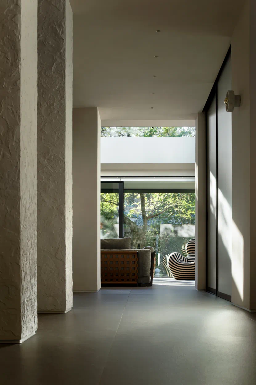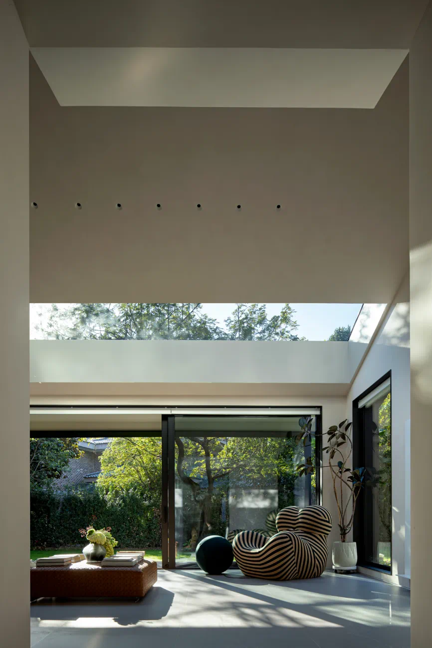 “打破”白墙,是通过视线的清透而实现的。在居住者与设计师的共同理解中,家不是封闭自处的,透过几面落地窗,以及上方的天窗,它可以融通多变,一边与自然相接,一边保持柔软克制的尺度。