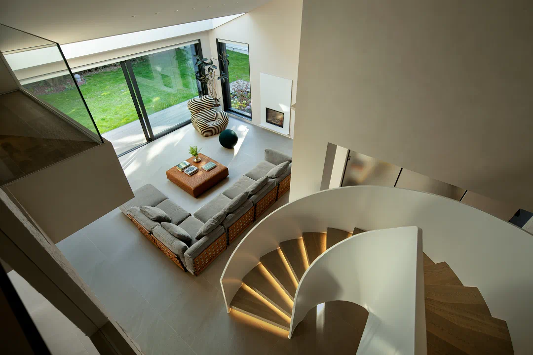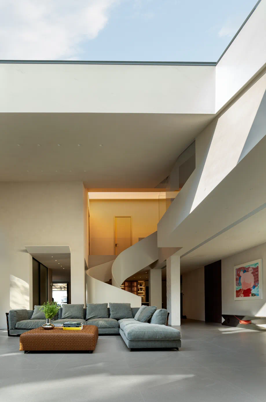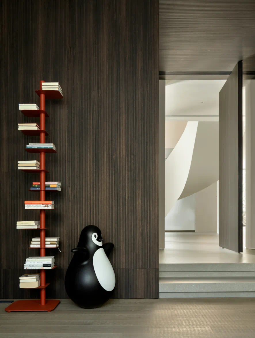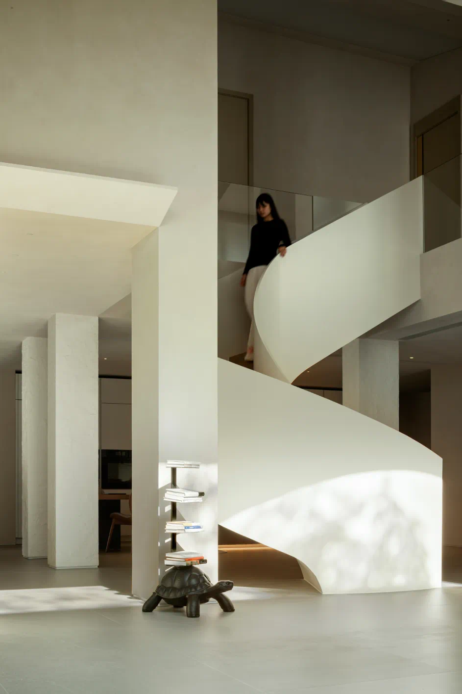 迂回流畅的楼梯形态与别墅规整的几何背景特质彼此呼应。与此同时,楼梯也将客餐厅划分出界限。