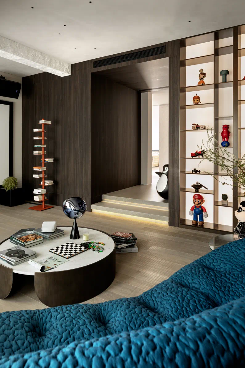 起居室采用深木色的背景,视野直通花园。充满创意的家具、手办令生活体验更加丰富。活力十足的色彩搭配,为生活悄然无声地注入些许活力。