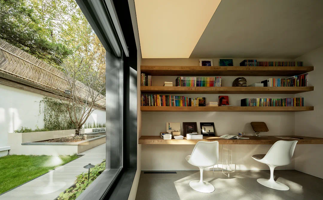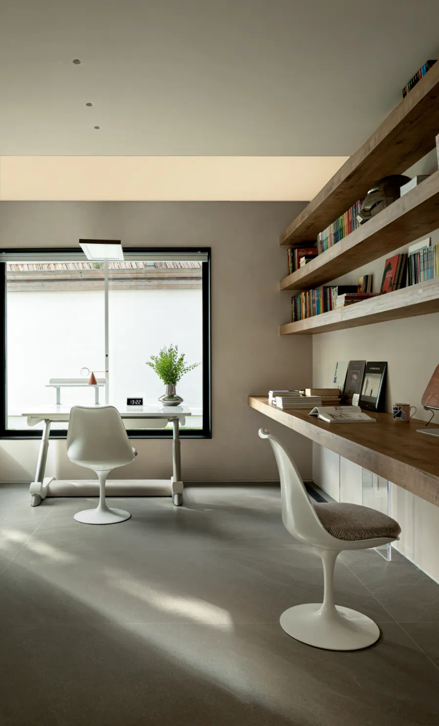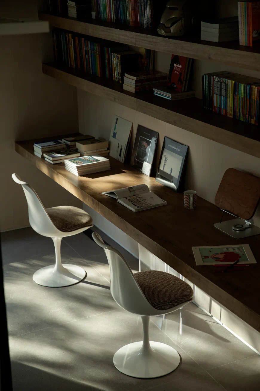 书房强调了“家庭性”,有别于传统书房的一桌一椅,这里没有重心。依墙而建的书架、书桌、座椅,每一位家庭成员都可以在这里坐下来,拿出一本书,静静阅赏,在深度的理解与体会中感受心在一起的默契。