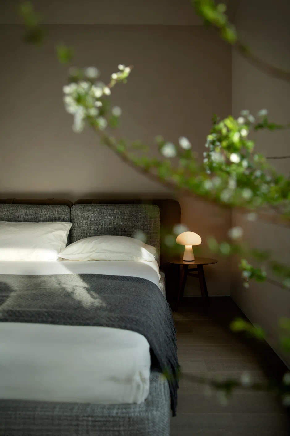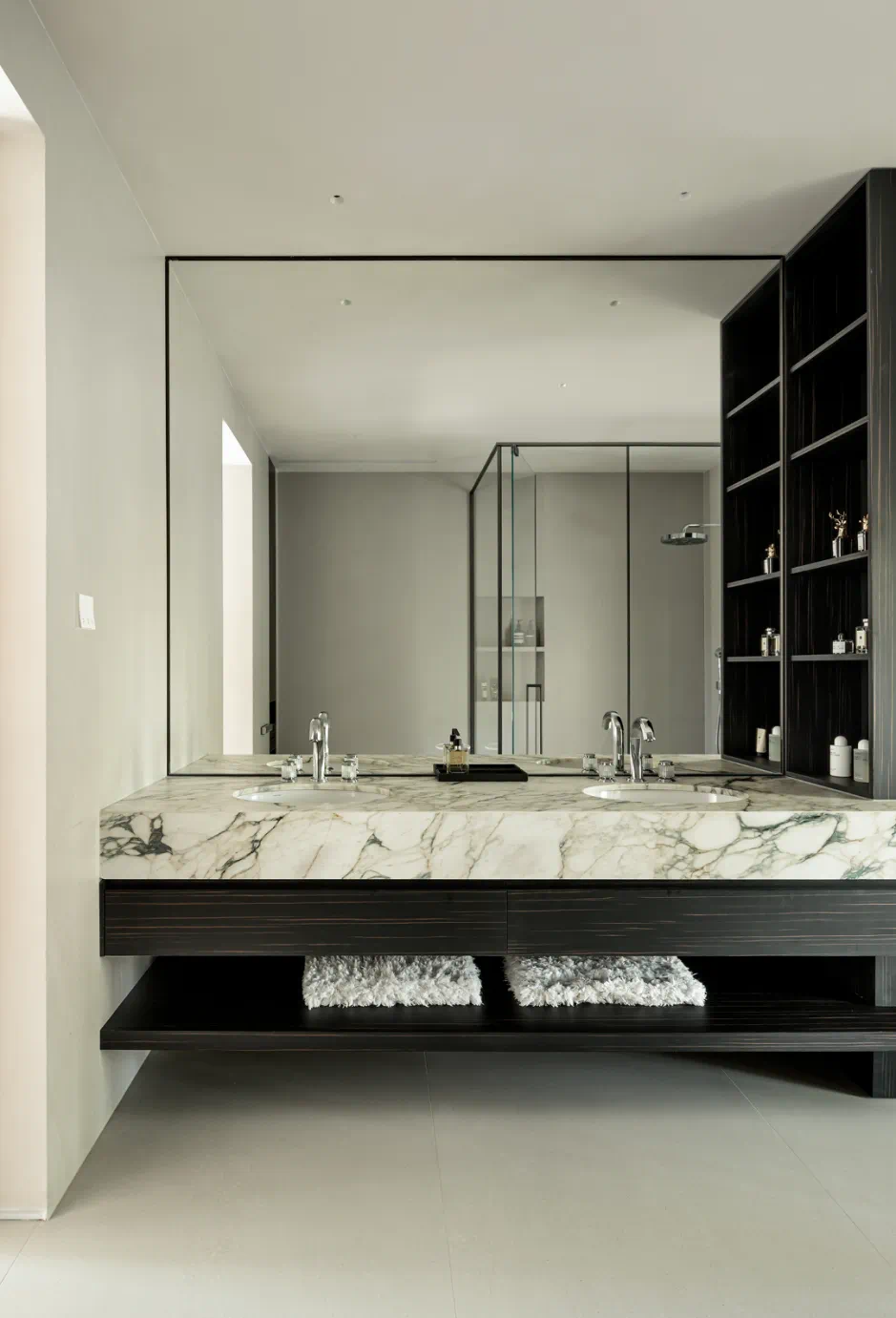 每间卧室都带有浴室,套房式的设计将日常生活动线联系起来。紧密衔接的空间和功能,为更多的休闲放松做了铺垫,也在公私区之间创建了一层“结界”。只要回归卧室,就能潜藏内心,默默沉淀。在夜晚消无前,独自绽放。