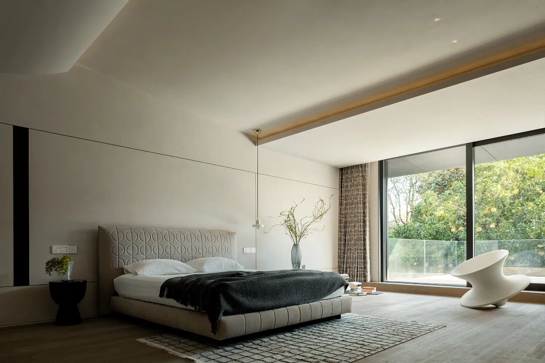 极简风格的主卧完完全全的被绿植、光影所包裹。绿植探入,落影横斜,自然的律动浸染着空间的底色,滋生出丝丝趣意。