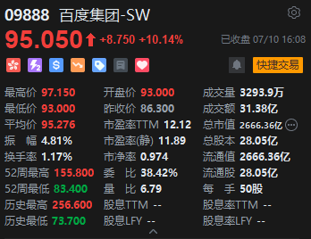 百度大涨超10%。近期,百度旗下自动驾驶出行服务平台“萝卜快跑”在武汉市全无人订单量迎来了爆发式增长。根据预测,该平台有望在2024年底在武汉实现盈亏平衡,并在2025年实现盈利。