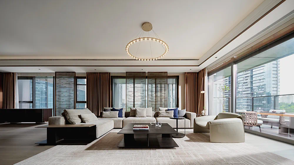 大宅自然而然的拥有了开阔的布局,白日的山湖,夜晚的灯红酒绿,在此刻都成为了室内的自然画作,点缀着生活。