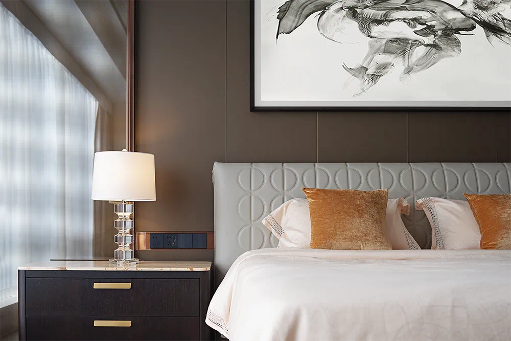 主卧内的深色系足以诠释此处的宁静,给人以无尽的享受之姿,眼前的光景好似一幅随时在变动的画作,让人能亲切的感知到生活的温馨,棕色的加入丰富了室内的色彩之美。
