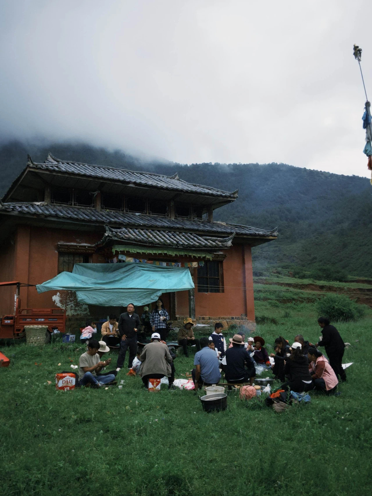 格姆山下寺庙边,一个母系大家庭每月十五来高山草原野餐(摄影:小满)在泸沽湖的生活,治愈了欧冠葳家庭的伤痛。四年前,父母的离婚使他一度陷入中度抑郁而无法工作,责怪自己太少陪伴父母,才导致家庭不和。“我如果没有来这里的话,到现在可能还是完全走不出来。”