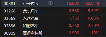 汽车经销商板块大涨,中升控股涨近26%。消息面上,日前有博主在微博上发文称,中升集团全面拥抱新能源,拿下50家(也有说48家)华为智选车授权。据悉,中升目前品牌组合涵盖梅赛德斯-奔驰、雷克萨斯、宝马、奥迪、等豪华品牌,以及丰田等中高端品牌,并在各核心品牌细分市场中均处于领导地位。今年上半年,公司新车销售收入为608.12亿元,同比减少5.8%,主要源于期内新车平均销售价格下降。