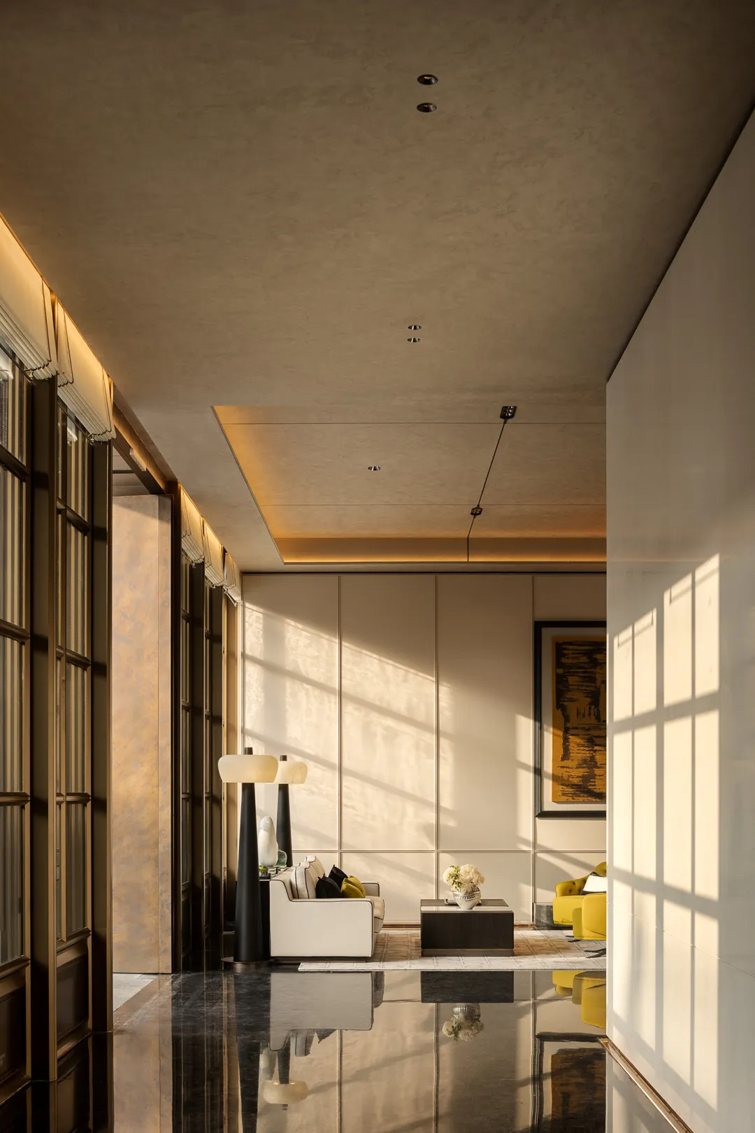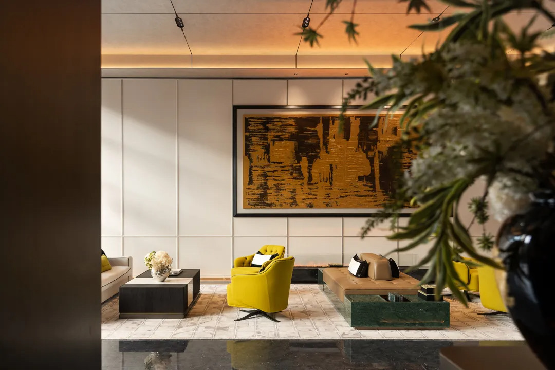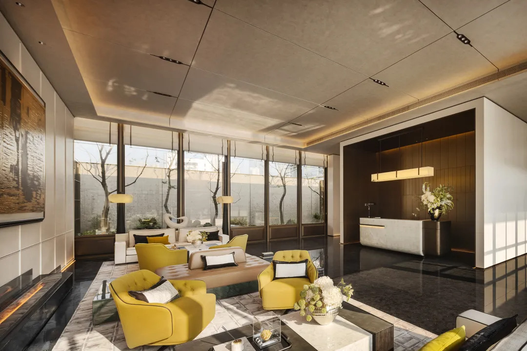 金陵古都,承载万千。生动的感受由四面向中心回溯,线条与光创造出微妙的明朗。黄色皮革沙发在自然光映射下优雅得体,松弛自洽的布局既有风度,又存留给来访者足够的自由。