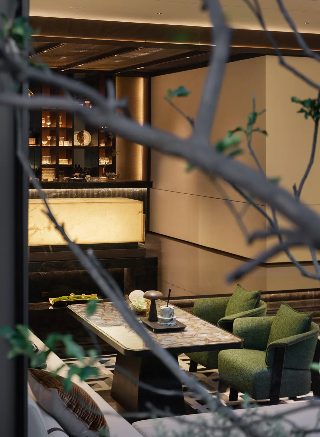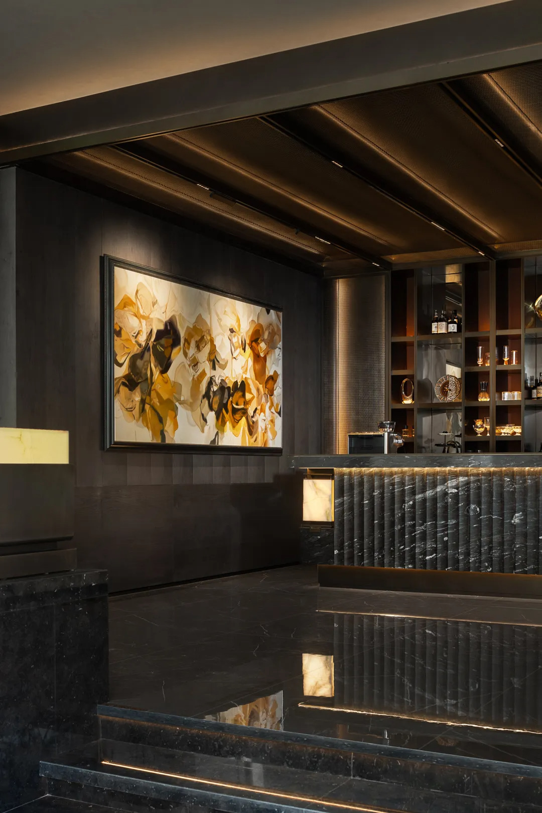走上台阶,深邃的理石将人们迎入另一个尽头。比起后方的明媚,酒吧区域显得深沉宁静,看似毫无温度的理石自带悠扬的叙事感。邂逅的痕迹堆叠,空间也愈发富有内涵。