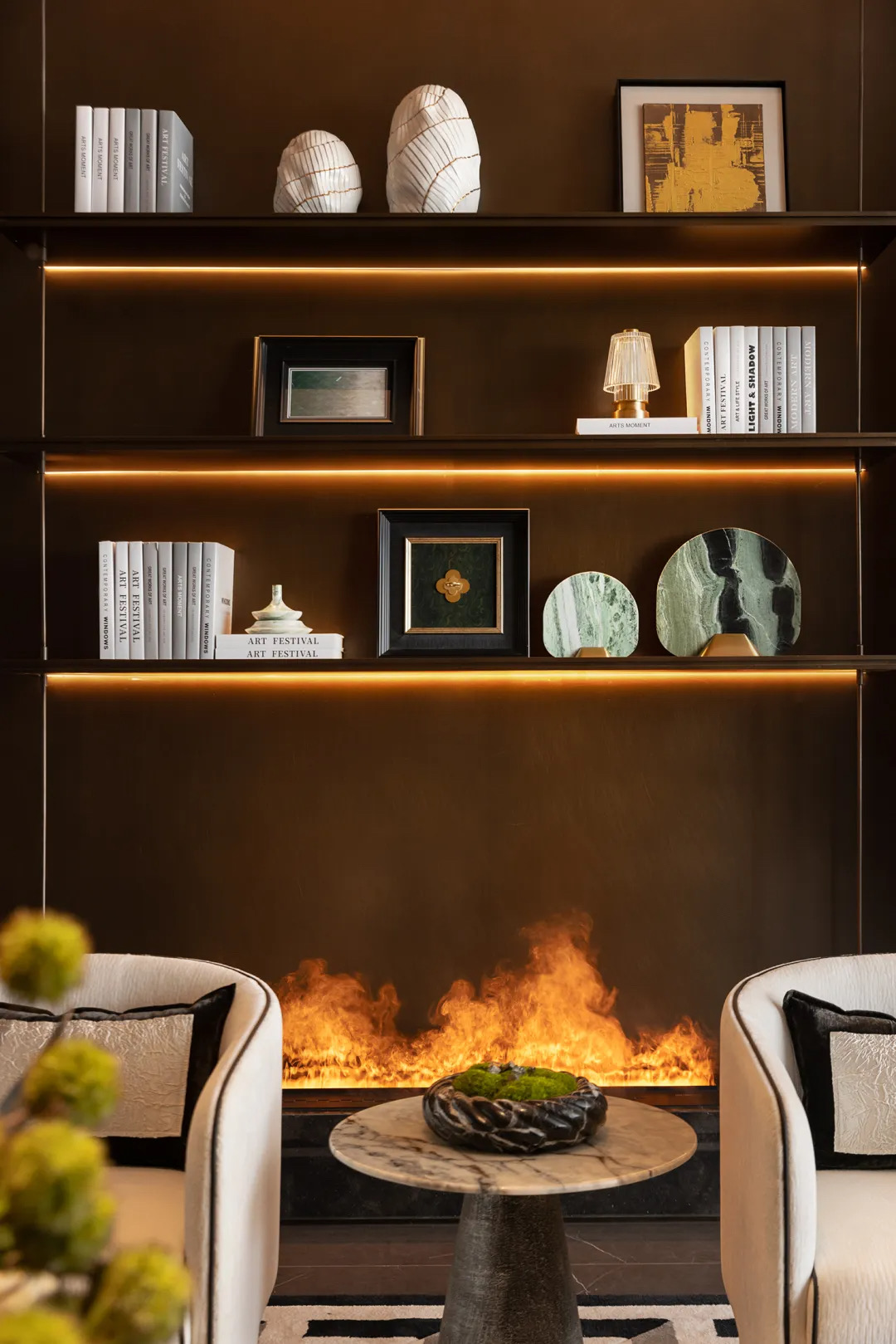 篝火丛生,在冬日燃起暖意。枝叶落雪,室内则盎然。欢笑鼎沸时,空间自如春。设计师将所有的体验感全部作为伏笔,藏匿在构线与色彩中。