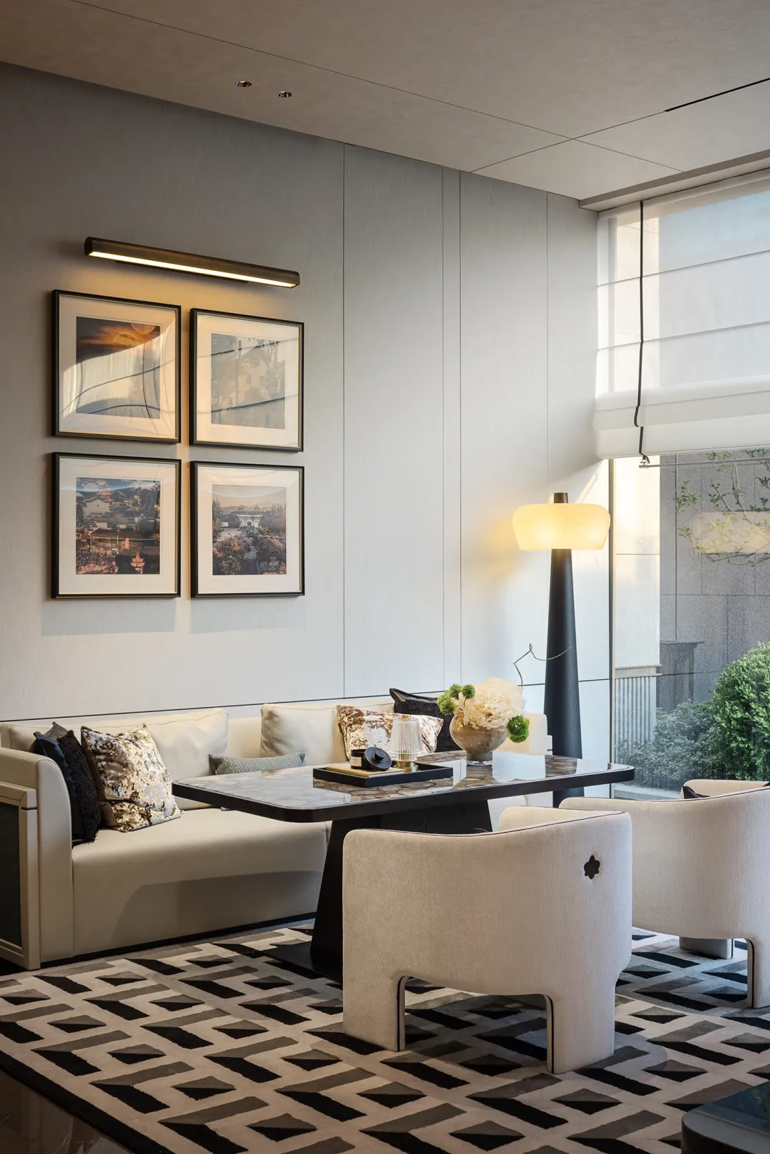 空间内部借助绿植与光线,营造出通透开阔的视野。从大堂区域开始,空间便致力于获得共鸣感。温和的光线注入其中,格纹为衬,简约美学的家有天地之通透,有无界之自由,还有几分城市所自带的中式风韵。