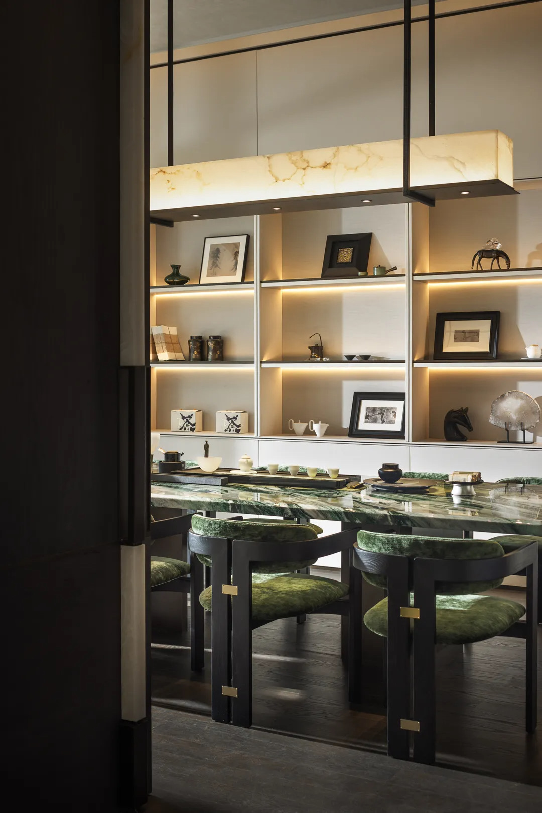 线条以及几何拼凑而成的视觉感,跟随这种感觉,就能抵达空间中的每一处。壁龛中的艺术茶具、与空间本身契合的家具、有序渐进的动线……我们看似顺应了原始的结构,实则不断在其中解锁新的体验与感悟。