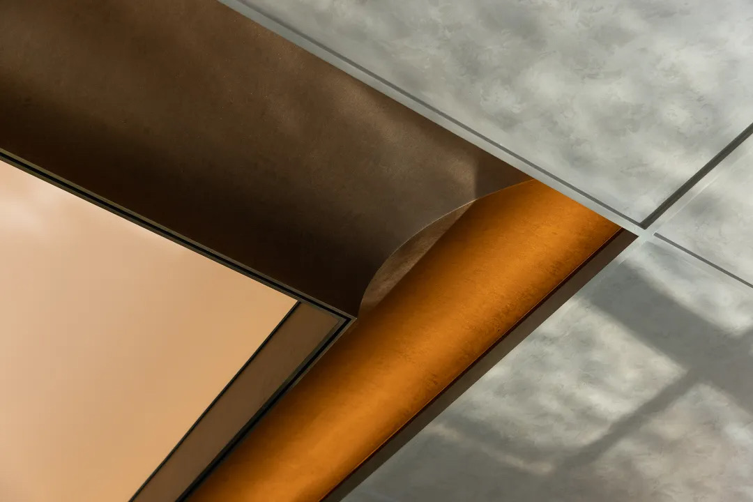 来到休息区,室外打造了一处微小的园景,婀娜的形态映衬着室内的横纵方寸。我们越过开篇,来到会客区。下沉式的结构将整个区域坚固地嵌入空间中,又将整个空间嵌入和谐雅致的园景之间。