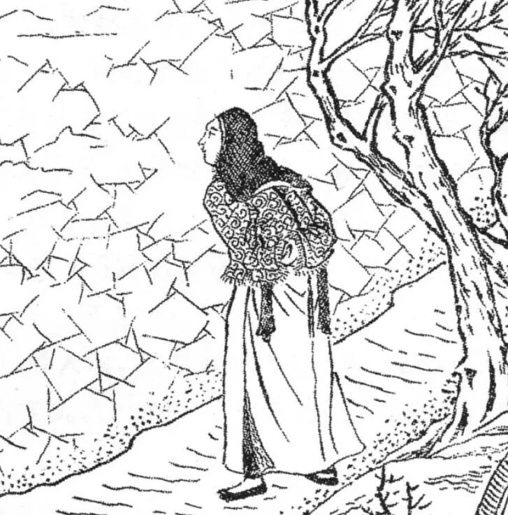 上图_ 明代万历《橘浦记》版画中冬日烤火的女子,头上围着卧兔