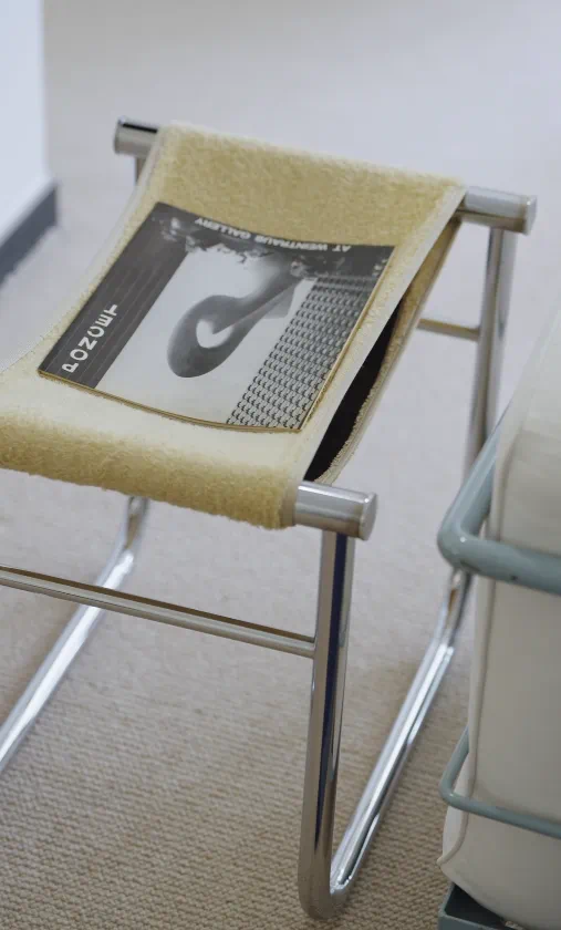 Jean Prouvé booth当时用的门板,装了木框,像装置画一样靠在窗边。客厅有特别多可以随时坐下来翻翻书、发发呆的地方。比如我最近收的Jean Prouvé经典的躺椅,坐下来可以慢慢地往后移动,然后再弹射回来,像坐宇宙飞船一样。