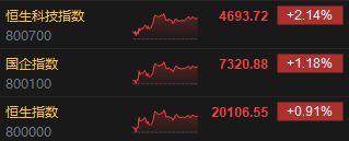 1月21日消息,港股三大指数集体收涨,截至收盘,恒生指数(20106.551, 180.74, 0.91%)涨0.91%,报20106.55点,恒生科技指数(4693.72, 98.52, 2.14%)涨2.14%,国企指数涨1.18%。盘面上,科网股普涨,小米涨超3%,美团涨近2%,百度、京东涨近1%;半导体概念股集体走强,中芯国际(41.9, 2.50, 6.34%)涨超6%;苹果概念股涨幅居前,舜宇光学科技(70.2, 4.75, 7.26%)涨超7%;内房股走势活跃,碧桂园(0.57, 0.09, 17.53%)复牌大涨逾17%;汽车股齐涨,小鹏汽车涨近6%。