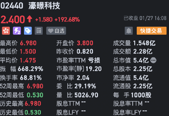 濠暻科技(2.4, 1.58, 192.68%)涨超192%。消息面上,濠暻科技公布,控股股东及其他股东向独立第三方陈展程转让合共70.11%股权,涉及合共1.57亿股,总代价1.4亿港元,相当于每股作价0.889港元。完成后,买方须按例提出强制性全面要约,每股现金价0.889港元,较停牌前收报溢价8.41%。 结束后,要约人拟维持公司的上市地位。