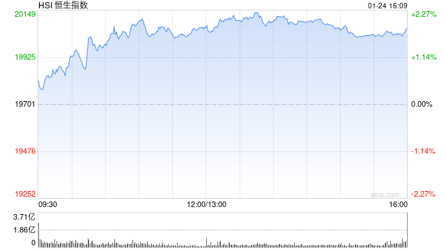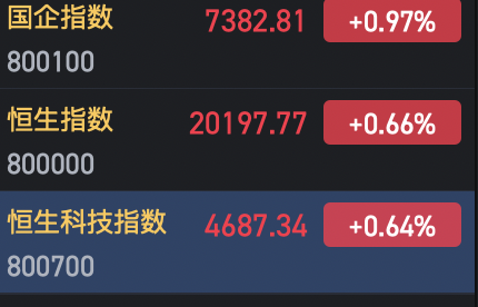 1月27日消息,港股三大指数集体收涨,截至收盘,恒生指数(20197.77, 131.58, 0.66%)涨0.66%,报20197.77点,恒生科技指数(4687.34, 29.73, 0.64%)涨0.64%,国企指数涨0.97%。盘面上,科网股普涨,阿里巴巴涨近3%,腾讯、京东涨超1%;芯片股集体大跌,中芯国际(38.15, -3.15, -7.63%)跌超7%;内房股多数上涨,融创中国(1.59, 0.09, 6.00%)涨6%;苹果概念股跌幅居前,高伟电子(25.85, -1.45, -5.31%)跌超5%;AI概念股美图公司(3.64, 0.51, 16.29%)涨超16%。