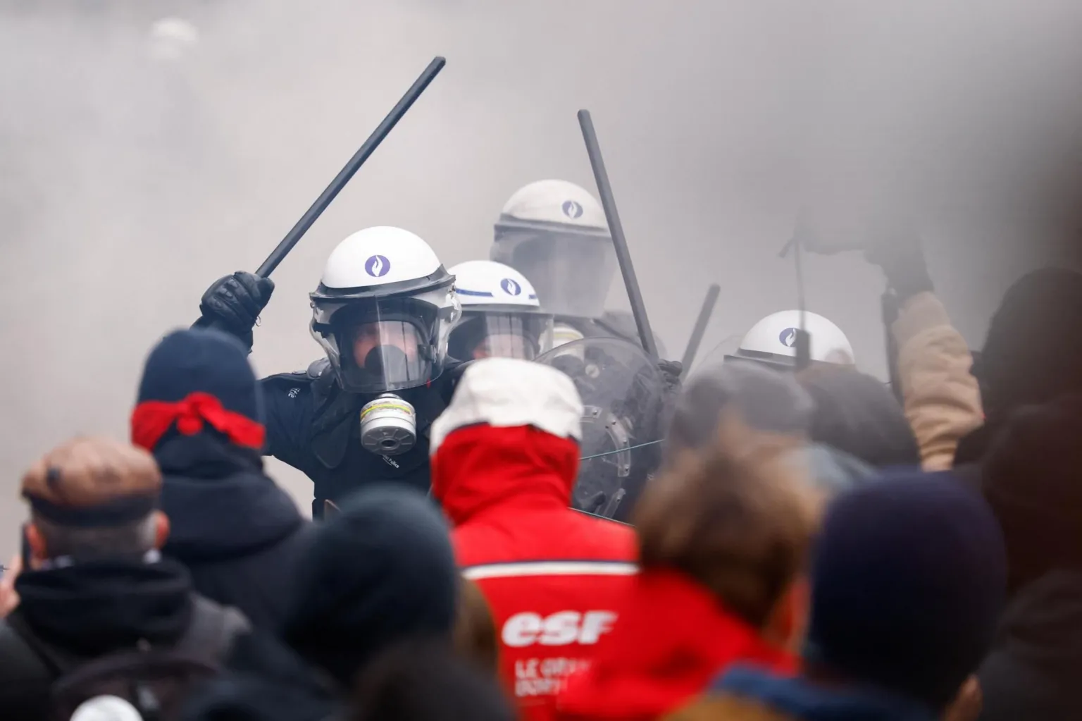 Belgian riot police confront demonstrators in Brussels during a national strike by trade union members, who are protesting against proposed cuts to public services.