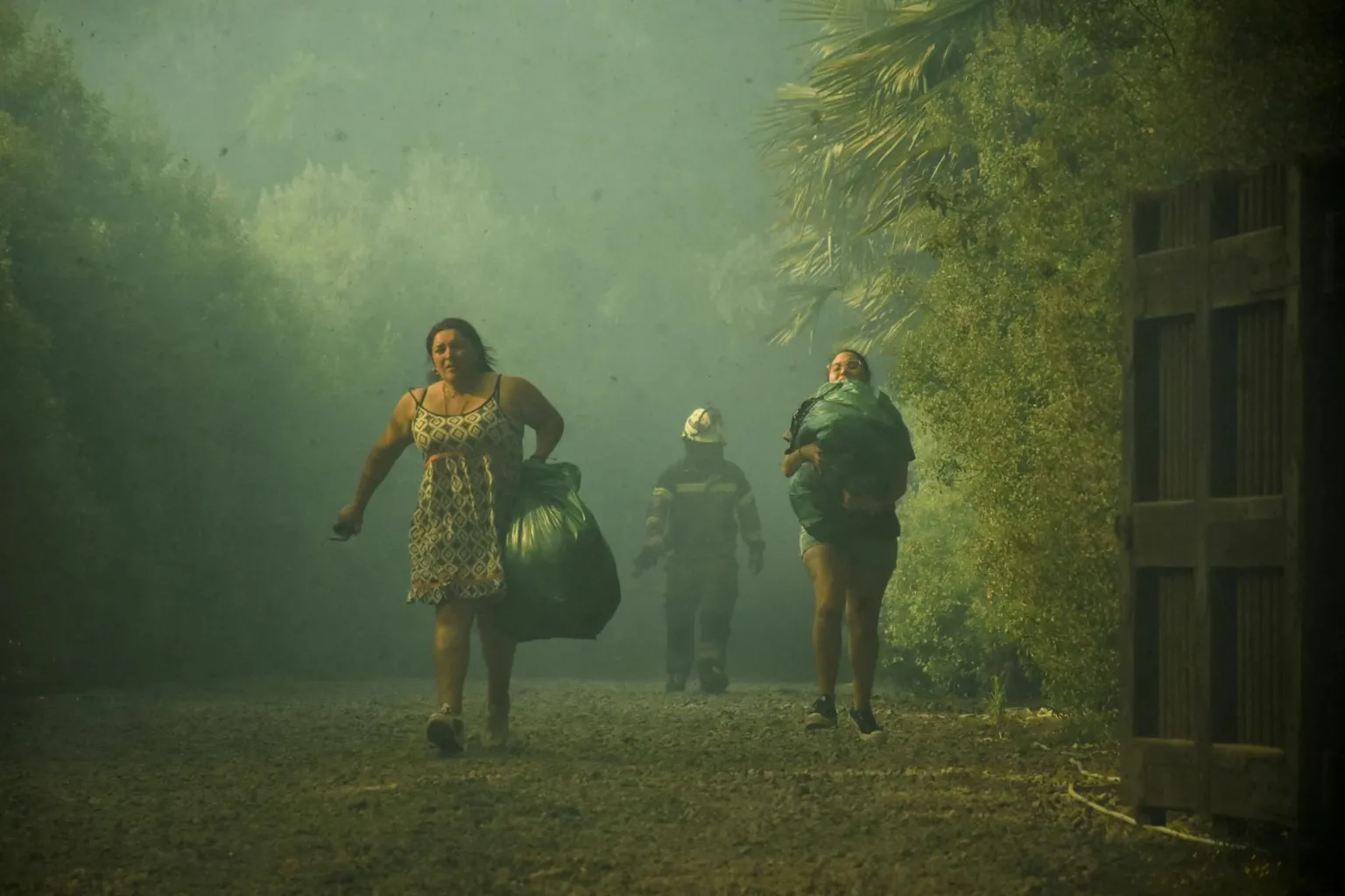 People carry their belongings in bags as they escape the spread of wildfires near Lautaro in Chile.