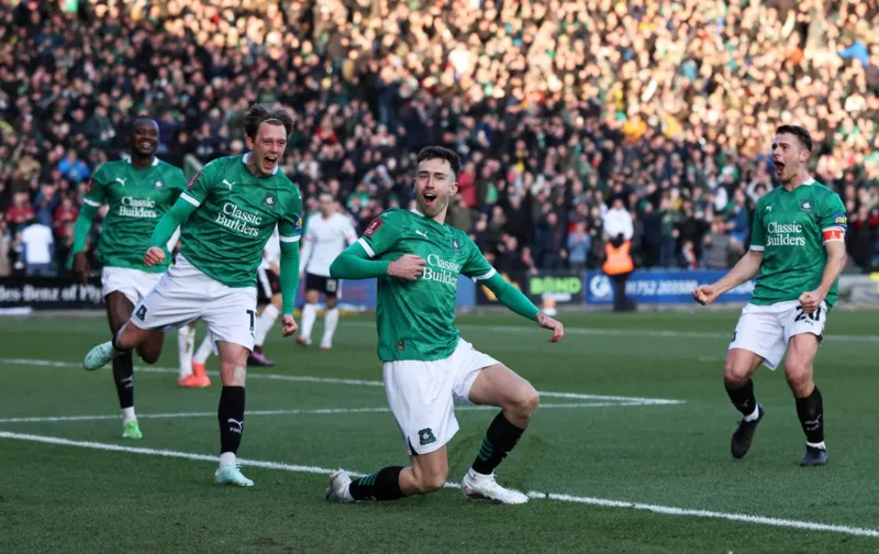 Ryan Hardie celebrates scoring the winning goal as Plymouth Argyle cause a huge upset by beating Premier League leaders Liverpool 1-0 to progress to the fifth round of the FA Cup.