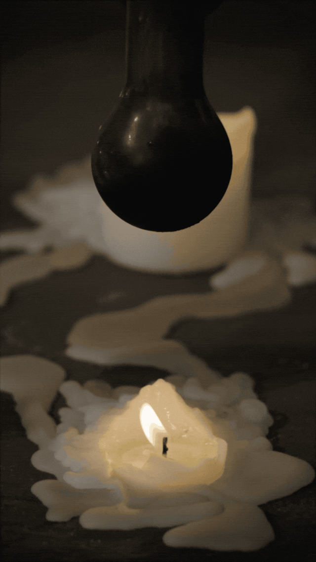 玻璃容器里面,放着写满作品想法的纸条。当炙烤容器的蜡烛烧化,当金钱不再是创作的限制时,创作还会存续吗?”
