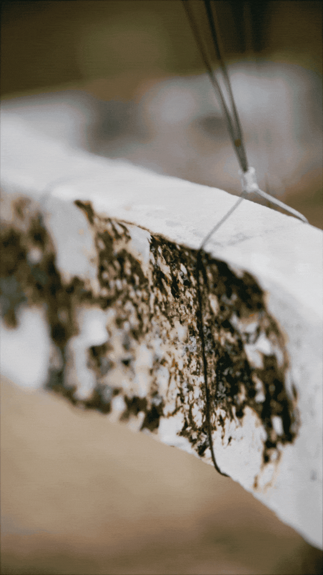 这件玻璃摇椅,原型是一把被白蚁啃噬得七零八碎的椅子,我们把部件拆开,直接在上面浇玻璃,放进窑里烧制,让灰烬封存在玻璃里,像火化一样留存物体的遗体