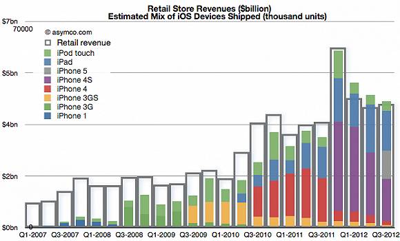 根据第三方数据机构Asymco的图表来看,2012年的第一、二、三季度的销售业绩要比往年(2007至2011年)同时期都高。