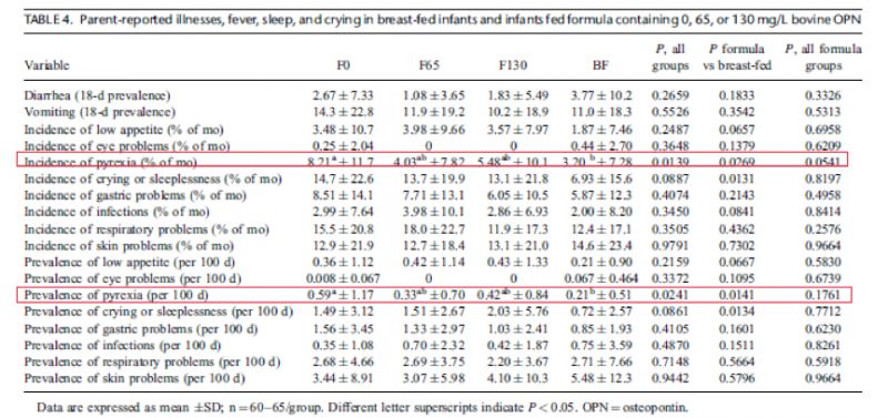 注:红框为婴幼儿各组的发热发生率,F130 和 F65 是实验组(添加 LPN 乳清蛋白),F0 是对照组(未添加),BF 是母乳喂养组。这张表格还提供了其他内容的对比,比如睡眠、食欲、皮肤等,感兴趣的朋友可以深入研究。
