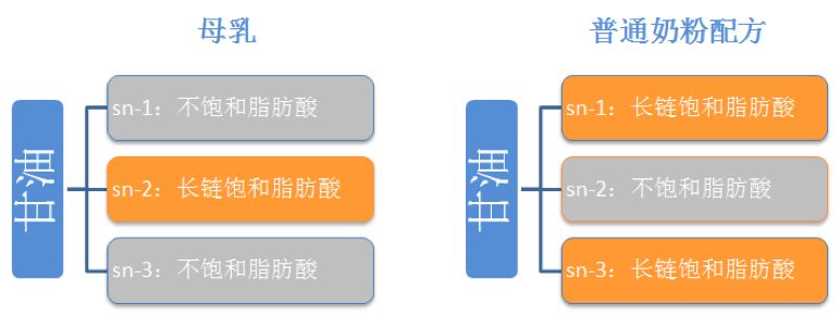 母乳的甘油三酯按照顺序分别是 sn-1, 3 位是不饱和脂肪酸,sn-2 位是长链饱和脂肪酸,而普通配方奶粉的脂肪组成则和母乳相反,如下图所示。