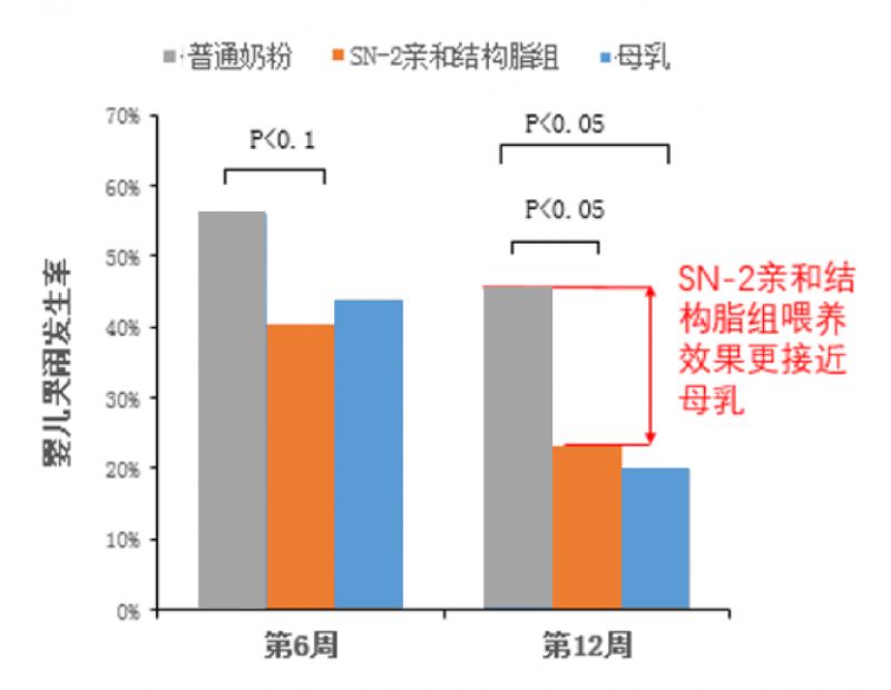 而另一篇对 SN-2 PLUS® 亲和结构脂添加的奶粉喂养研究发现,含有 SN-2 PLUS® 亲和结构脂的奶粉还可以显著地减少宝宝的哭闹情况,在喂养 SN-2 PLUS® 亲和结构脂奶粉 12 周之后,宝宝的哭闹比例和哭闹持续的时间都发生了下降,喂养效果更接近母乳喂养儿(Yoseph F B)。