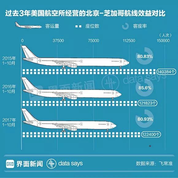 根据民航咨询机构CADAS的数据,北京与芝加哥航线在去年前10个月里平均客座率虽然达到80.9%,但是同比下滑近5个百分点,与此同时客运量同比下降了5.2%,与2015年同期相比更是下滑12.7%,是从北京始发的中美航线中下滑最厉害的一条。