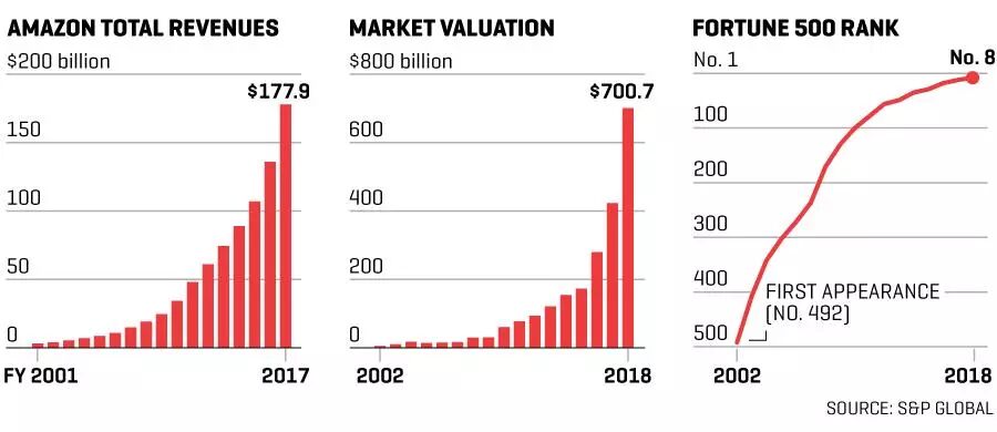 从左至右:亚马逊总收入;市场估值 ;《财富》美国500强排名