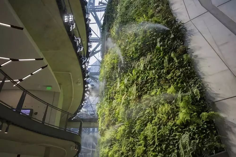 布满植物的墙上可见到通风管道,用于吸入新鲜空气和模拟室内自然风。