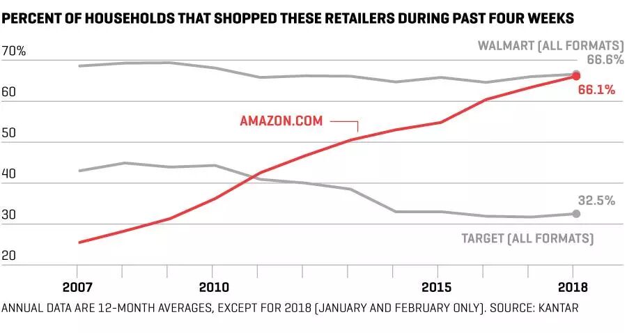 Wedbush分析师迈克尔·帕切特解释说:“是沃尔玛开了先河。”曾负责沃尔玛美国生鲜食品业务长达8年的杰克·辛克莱尔说得更明白:“人们一旦进店购买生鲜食品,他们就会东走西看,顺带买一些别的东西。亚马逊做的事情实质上跟沃尔玛一样。”而摩根大通预测,到2021年亚马逊在美国的零售额将和沃尔玛相当。