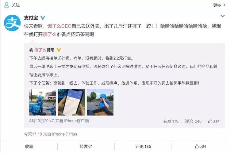 当天晚些时候,阿里巴巴集团副总裁、饿了么 CEO 昆阳在微博发文,坐实「CEO 送外卖」一事,称:「下午去蜂鸟接单送外卖,六单,没有超时,收到 2.2 元打赏。」他表示骑手任劳任怨使命必达,饿了么的产品和管理也要拼命跟上。(来源:快科技)