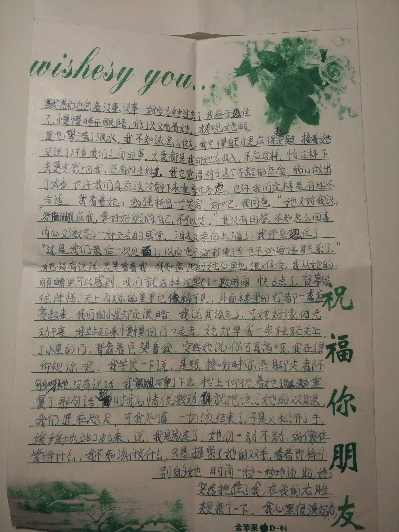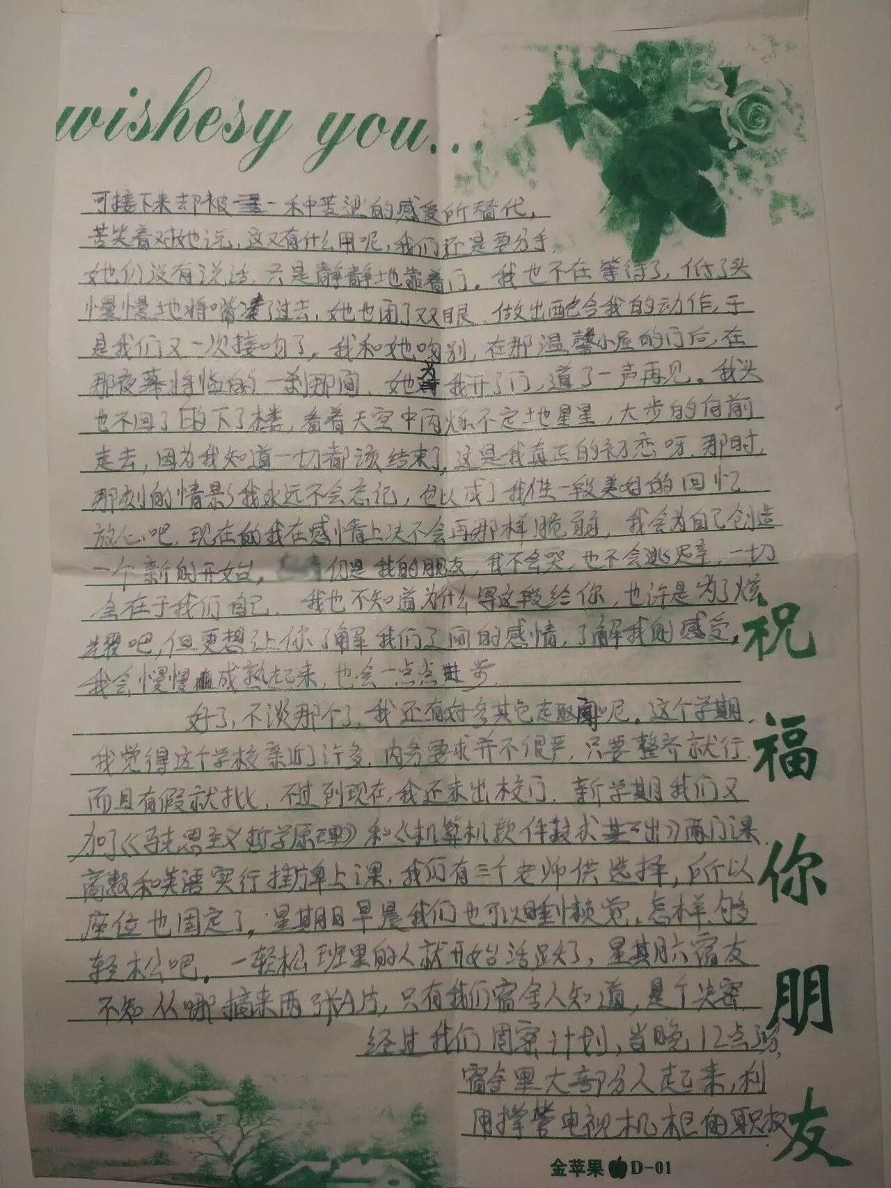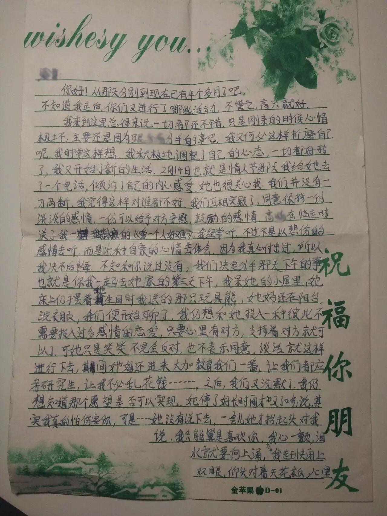 写信来的是我从光屁股时候就在一起玩的好友,这封信是说他和女友分手的事。信中女主角是他高中的同班同学,俩人在一起3年,在之前的来信中,他会把两人的恋爱进展一一告诉我。比如接吻的感觉(那时我还没对象),省钱给她买礼物,每次打电话都打很久之类的。