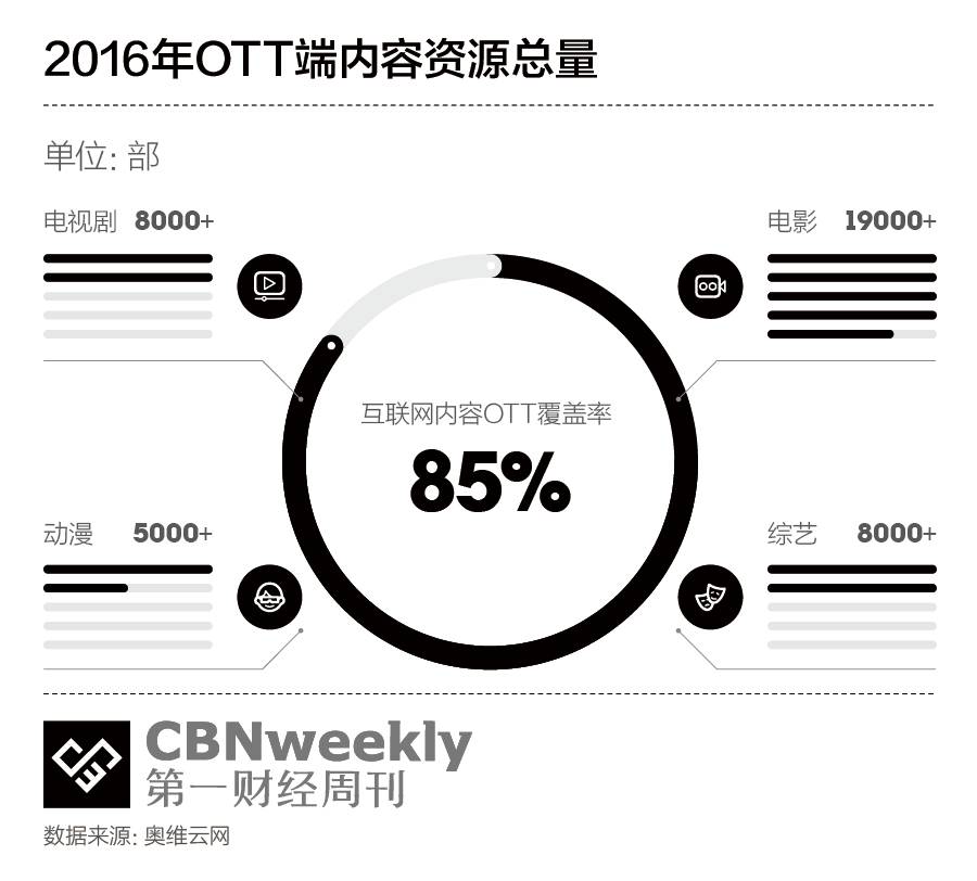 最终,彻底的民资破局,借助的是OTT TV(Over-The-Top TV,即互联网电视)模式,利用互联网给电视用户传输内容。根据奥维云网的调查,截至2016年12月,互联网电视的内容资源总量,包括8000多部电视剧、1.9万多部电影、5000部动漫以及8000多部综艺节目,覆盖了85%的网络视频资源,而互联网电视终端设备保有量则超过2亿台,覆盖了36%的中国家庭。