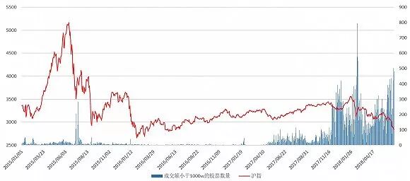 界面新闻统计了2015年以来两市成交量小于1000万的股票数量的变化情况,结果显示,自去年5月份以来,符合筛选条件的股票数量明显开始增多。今年以来更是呈现出了集中爆发态势。