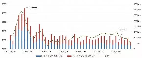 成交额方面的数据也印证了上述情况。由下图可见,自2015年6月创下峰值之后,两市成交总额一度出现断崖式下跌,2016年之后就一直处于低位震荡状态。今年以来,伴随年初沪指的一轮大跌,两市成交总额近期总体下行趋势明显,其中2月份为6.41万亿元,仅为2015年6月峰值时的18%。