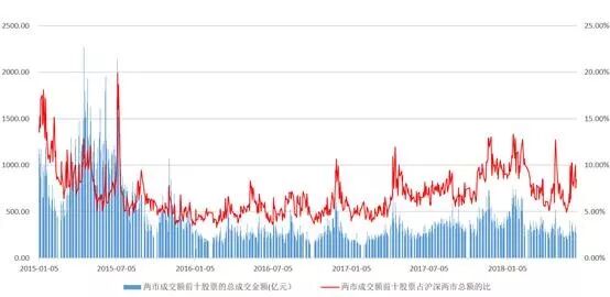 2016年全年A股成交额前十的股票在沪深两市成交总额中的占比维持在5%左右。而自2017年3月份之后成交量排名前十位的股票占比稳步提升,近期又再次回升至10%附近。总体来看,处于2015年以来的相对高位水平,这在很大程度上表明现阶段市场资金向少数个股聚拢的效应十分明显。