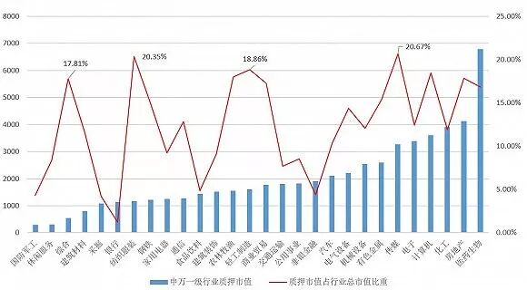板块方面,以申万一级行业为分类参考,各个行业质押市值占行业总市值的比例分化较为明显。其中占比超过15%的行业共有10个,传媒和纺织制造业分别以高达20.67%和20.35%的质押市值占比居于前两位。