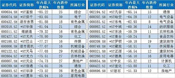 反映在市场表现上,基本面普遍较差的ST个股首当其冲,被投资者集体抛弃。数据显示,今年以来已经有27只ST个股年内的最大跌幅超过了五成,最惨的*ST富控跌幅高达85.22%。