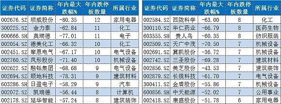 值得注意的是,南京新百并非孤例,近期有不少庄股赫然出现在闪崩股名单之列。界面新闻统计了部分崩盘庄股今年以来的表现情况,其中22只个股年内跌停板数量在6次以上,最惨的顺威股份今年已经遭遇了12个跌停板,股价最大跌幅高达80.35%。
