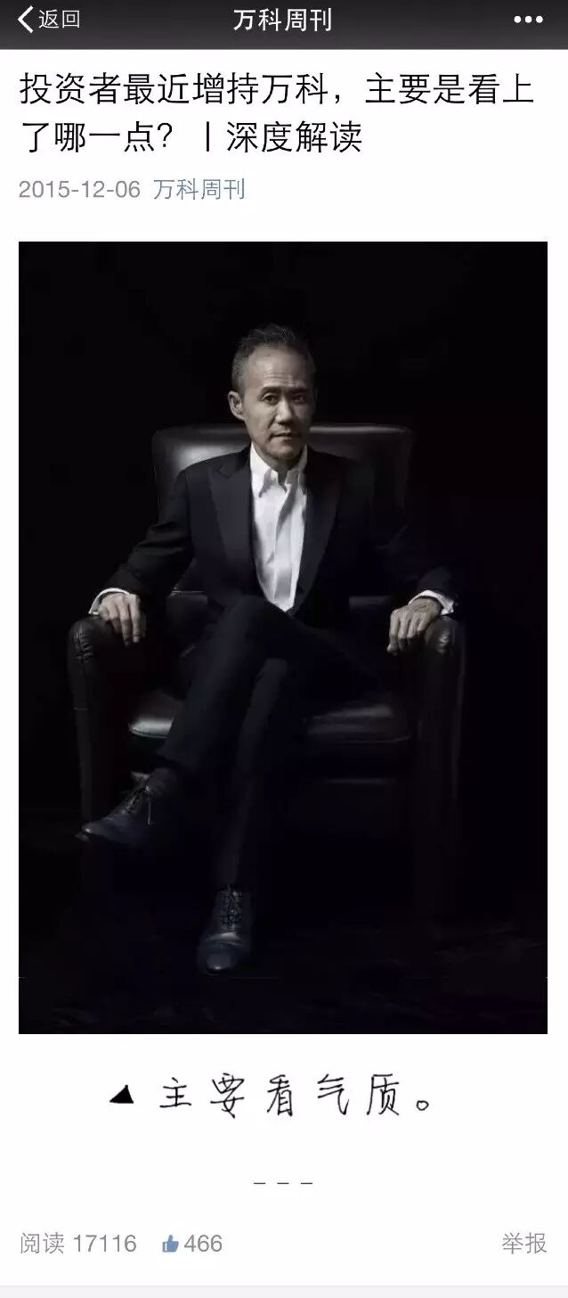 “投资者最近增持万科,主要是看上了哪一点?”昨晚,万科官方微信公号“万科周刊”用了5个字来回答这个问题:“主要是气质。”