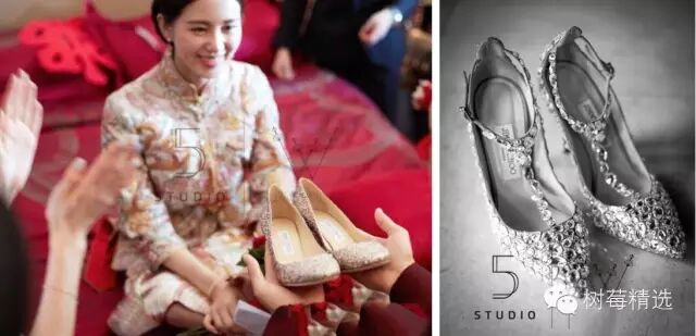 刘诗诗此次的婚鞋来自英国品牌Jimmy Choo, 这个品牌曾是已故王妃黛安娜最爱的鞋履品牌,诗诗主婚礼脚上穿的这双来自Jimmy Choo MEMENTO系列的STORM水晶鞋,价值约25000RMB,同时她也是全球首位穿上这双鞋的艺人:
