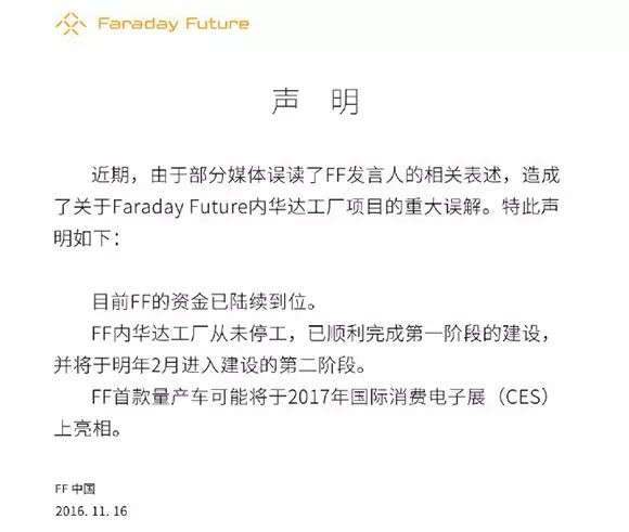 法拉第公司对此传闻予以了巧妙地回应,在11月16日公司官方微博回应中,称“已经完成了第一阶段的建设,并将于明年2月进入建设的第二阶段”。