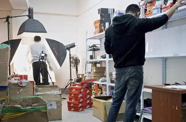 逛了3个晚上之后,我觉得自己已经有足够的资格,给偶遇的一对儿想做微商的小情侣讲讲课了。 我是在一家鞋店碰到这对怯生生的小情侣的。在店门口犹豫了半分钟,男的才带头进来,俩人跟3天前的我一模一样,装模作样拿起每双鞋又掰又拧。 此时的我,已经能和鞋店老板们闲坐着喝茶扯淡了。 满大街发小卡片拉人看货的大姐们,似乎已经把一个操着北方口音的不差钱老板来找最NB的NB鞋的消息,告诉了安福的每一个老板,以至于我刚从书包里掏出那双“总统跑”,就有人说:“知道你了,我们家也没有更好的货。” 小情侣来自江西,男的当兵转业,做微商的战友介绍他来安福看看,“这年头挣钱太不容易了”。 安福电商城挣钱就容易吗?我朋友圈里的阿冒们过的是典型的“美国时间”,他们大多每天中午12点开始接单,下午6点来不及吃饭就要整理单子,晚上骑摩托来安福拿货,有时凌晨3点才能把货拿全,之后还要拍鞋子实拍图,保证朋友圈微信群里的客户们能在第二天早晨醒来就刷屏收到自己的“爆真货”。  为假鞋拍摄产品照,从制造到销售,这里形成了一条完整的制假售假产业链条。图/小黑