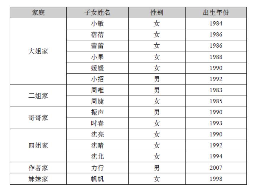 到今天,算上我儿子杨力行,大家庭一共有十五个孩子,女孩十一个,男孩四个。具体说来,每个家庭的子女如下 :